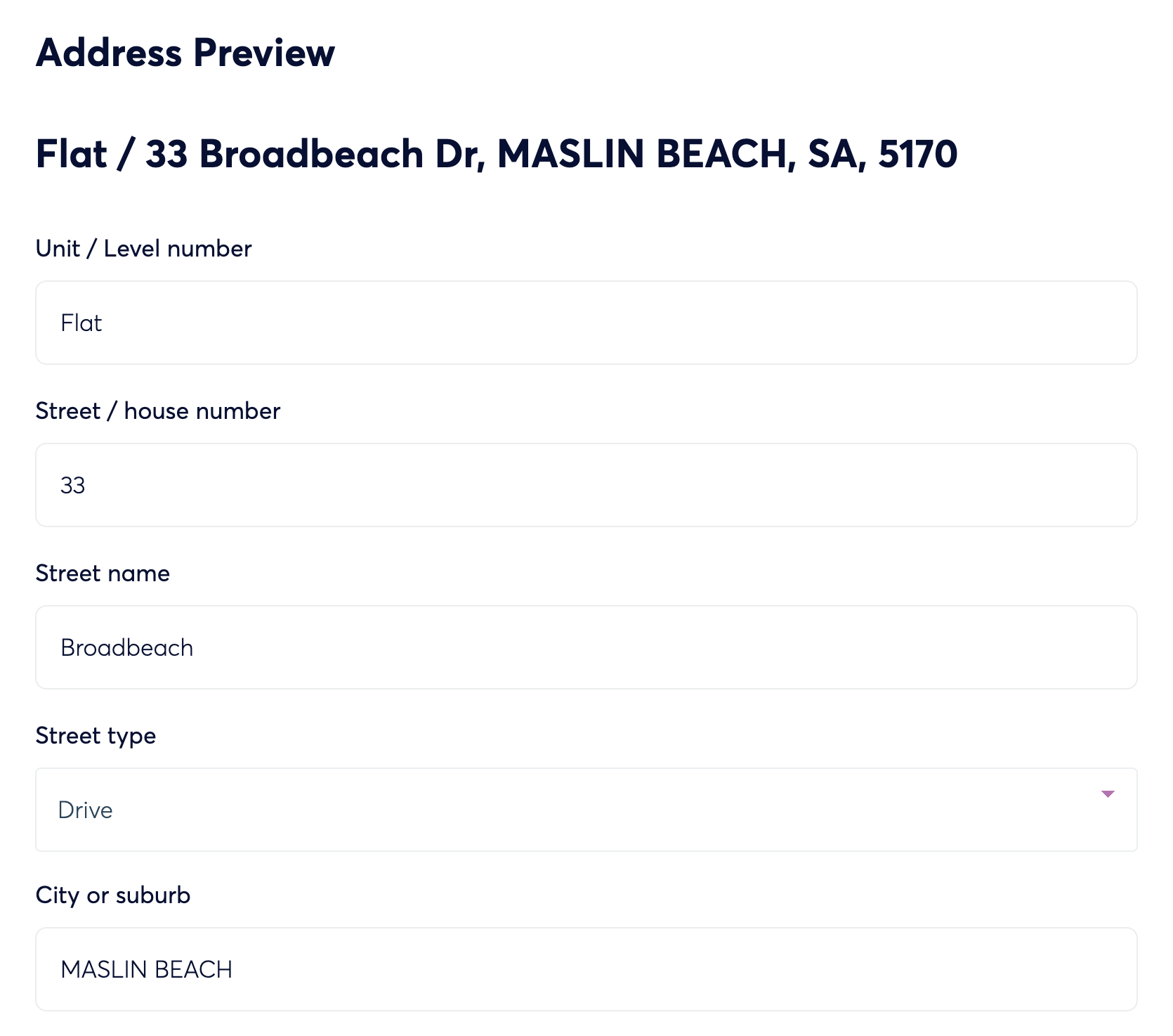 - In the address field, type the main property address where the granny flat is located (do not include the words “granny flat” in this field).